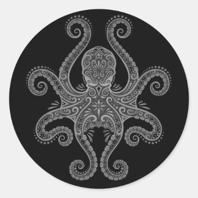 An intricate octopus design decorated with grey swirls and dots. The symmetrical pattern has all eight of it’s legs outstretched and it’s eyes looking forward. The octopus sits on a pure black background creating a subtle contrast on the surface of this sticker. The body and arms of the octopus are comprised of delicate lines that come together to form a stunning pattern. This stylish design is a beautiful take on this strange and wonderful sea creature.
