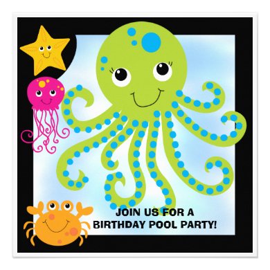 Octopus customizable birthday invitations with a smiling green octpus and crab design, so cute for kids having a beach or pool party or octopus theme birthday!