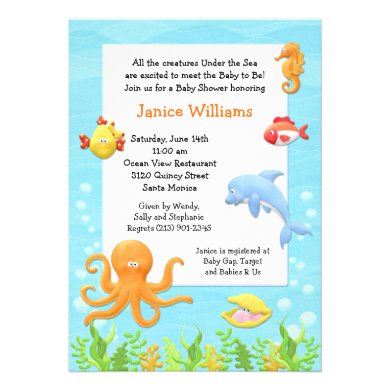 Personalize this Under the Sea Baby Shower invitation. It features a dolphin, octopus, fish and other friendly ocean animals. Some elements by nitwitcollections.com License #41088 Just change the details of the party and you're done!