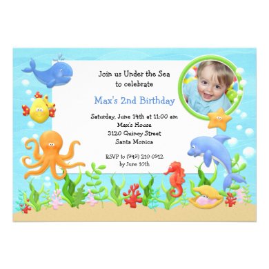 Personalize this child's Under the Sea Birthday Party invitation. It features photo of your child and a dolphin, octopus, whale, fish and other friendly ocean animals. Just change the details of the party and you're done! Some elements by nitwitcollections.com License #41088